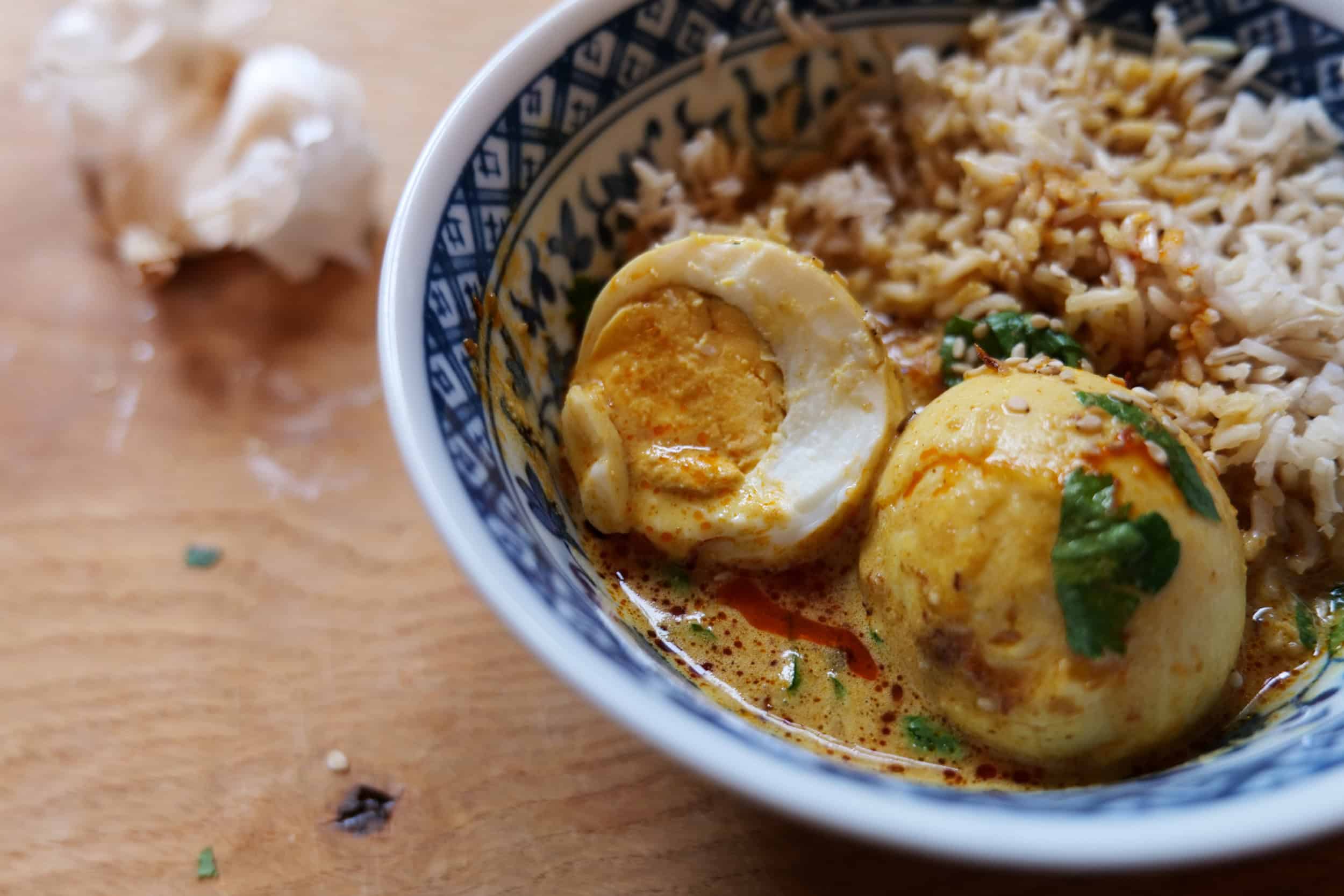 Ein wichtiger Kniff, damit die im Curry verwendeten Eier perfekt gelingen, ist die richtige Vorbereitung der Pfanne – besonders, wenn du wie ich einen Edelstahlwok benutzt. Edelstahl neigt dazu, empfindliche Zutaten wie Eier leicht anhaften zu lassen, wenn er nicht richtig vorgeheizt wird. Deshalb erhitze ich den Wok zunächst ohne Fett, bis er wirklich heiß ist – ein guter Test ist, ein paar Tropfen Wasser hineinzuspritzen: Sie sollten sofort zu kleinen Kugeln tanzen und verdampfen. Erst dann kommt das Ghee hinein, das durch seinen hohen Rauchpunkt ideal zum Anbraten ist und den Eiern zusätzlich einen feinen, buttrigen Geschmack verleiht. Die Eierkommen nun in die heiße Pfanne gegeben. So klebt das Ei nicht und löst sich besser vom Boden, ohne dass es zu sehr kleben bleibt oder zerfällt.