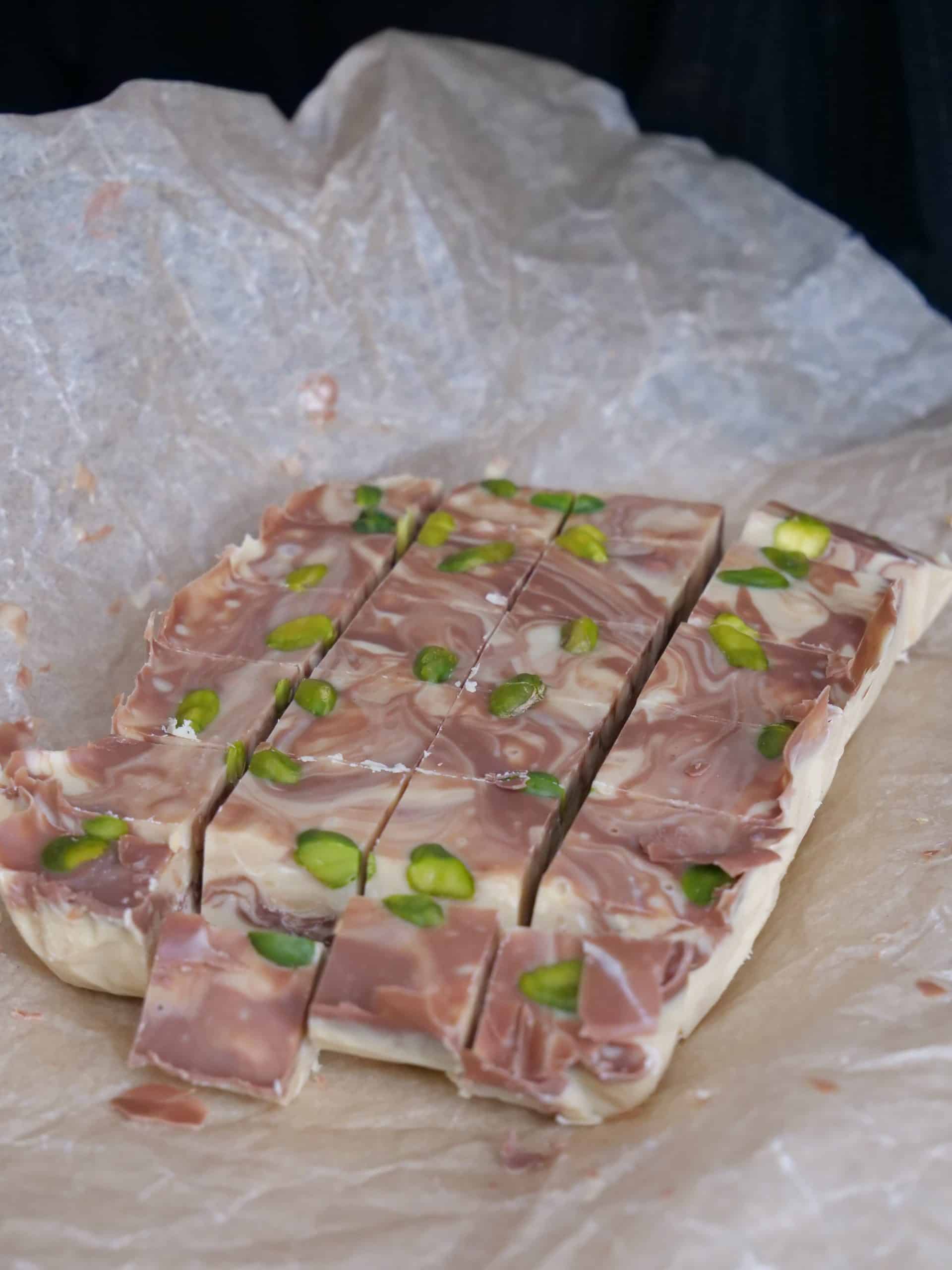 - Zum Schluss, bevor alles in den Kühlschrank geht, könnt ihr euer Fudge zum Beispiel noch mit Nüssen, Pistazien oder getrockneten Früchten toppen. Die Masse nun so lange im Kühlschrank stehen lassen, bis sie fest ist.Viel Spaß beim ausprobieren.