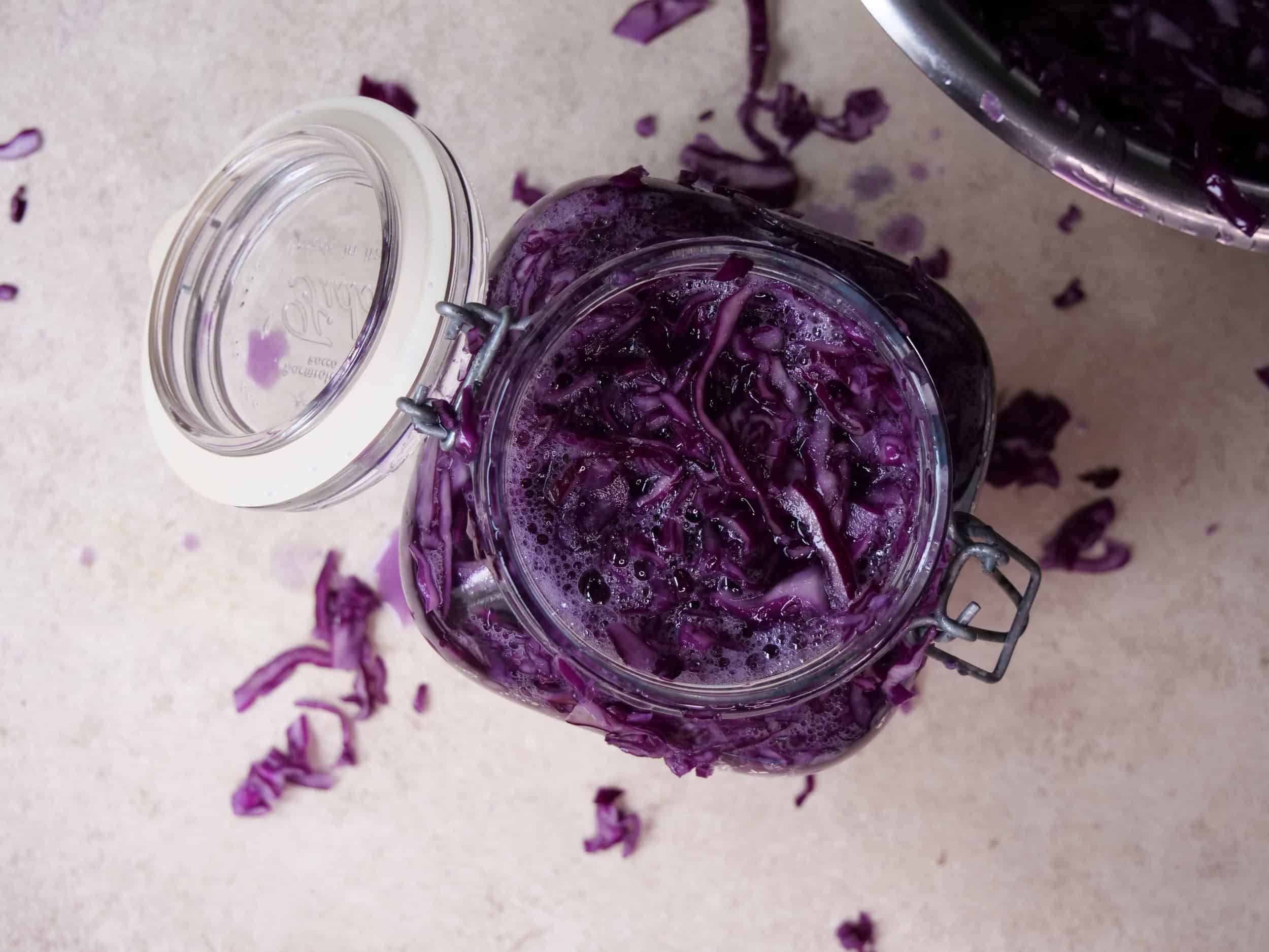 - Danach den Rotkohl fest in euer Glas drücken, sodass keine Luftblasen bleiben. Der austretende Saft sollte den Rotkohl vollständig bedecken. Falls nötig könnt ihr etwas Salzlösung nachgießen. Zum Beispiel 20g Salz auf 1 Liter Wasser.