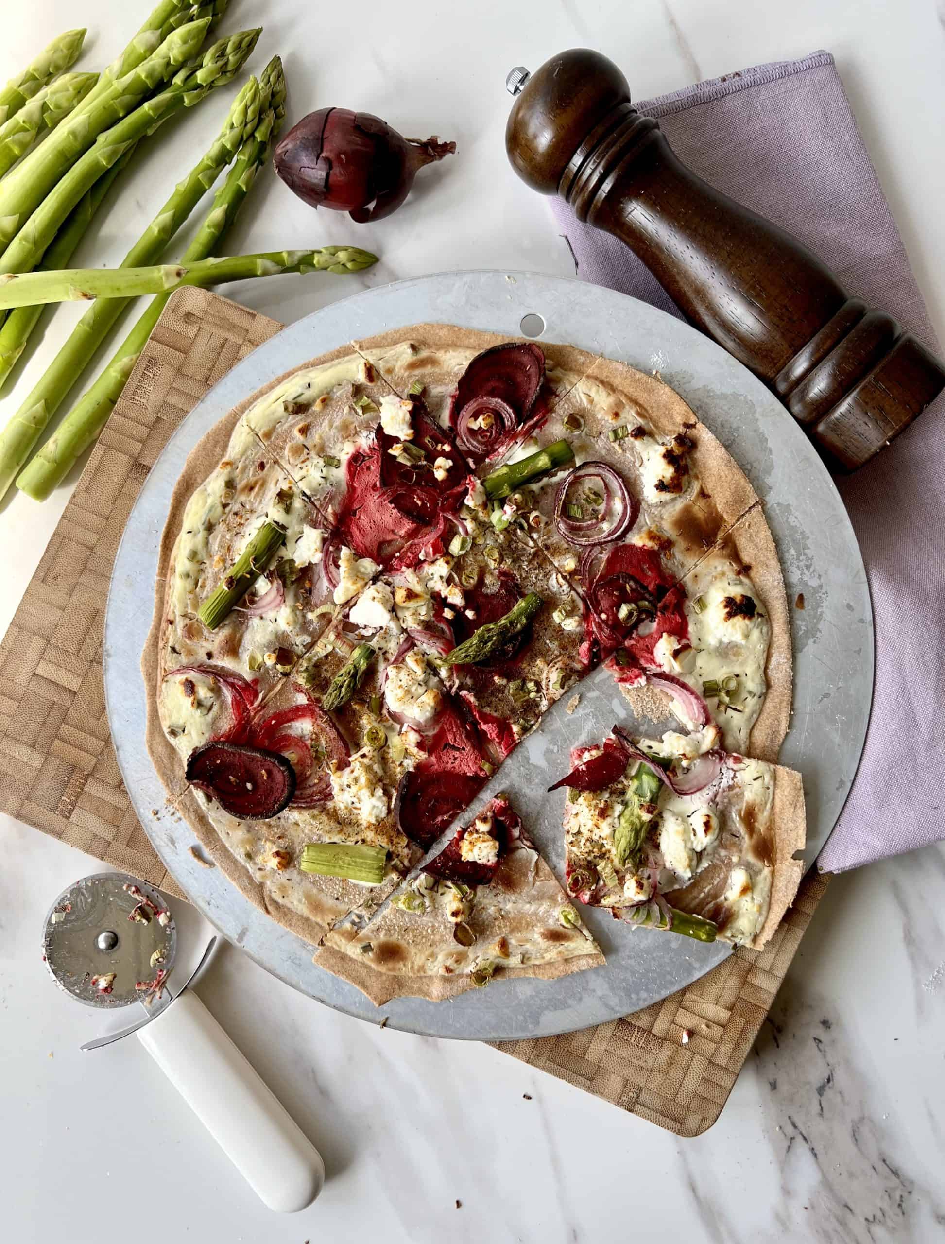- Für die deftige Varinate habe ich Rote Beete, grünen Spargel, rote Zwiebel und Frühlingszwiebel benutzt, zum Schluss kam noch etwas Feta drauf. Die süße Variante ist mit Erdbeeren und Rhabarber belegt worden.