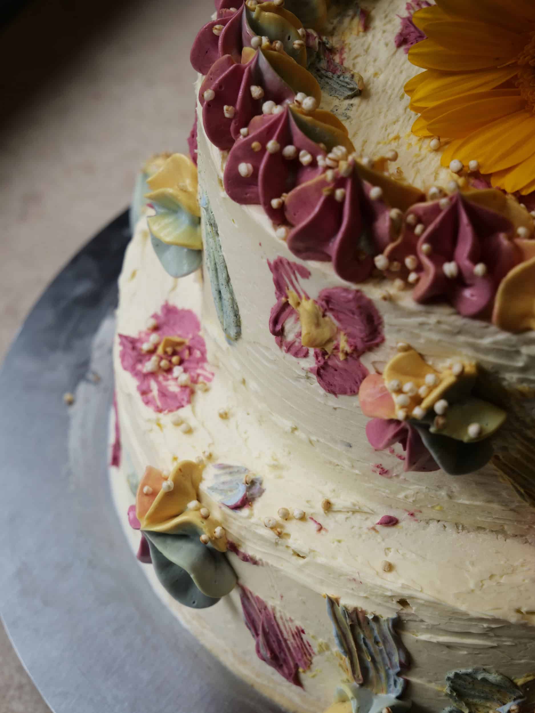 - Die beiden Tortenböden werden nun gestapelt und nochmals mit einer dünnen Schicht Buttercreme zusammengefügt. Jetzt kann die Torte nach belieben dekoriert werden. Ich habe mich für farbige Buttercremerosetten und Quinoapuffs, sowie frische Blumen als Dekoration entschieden.