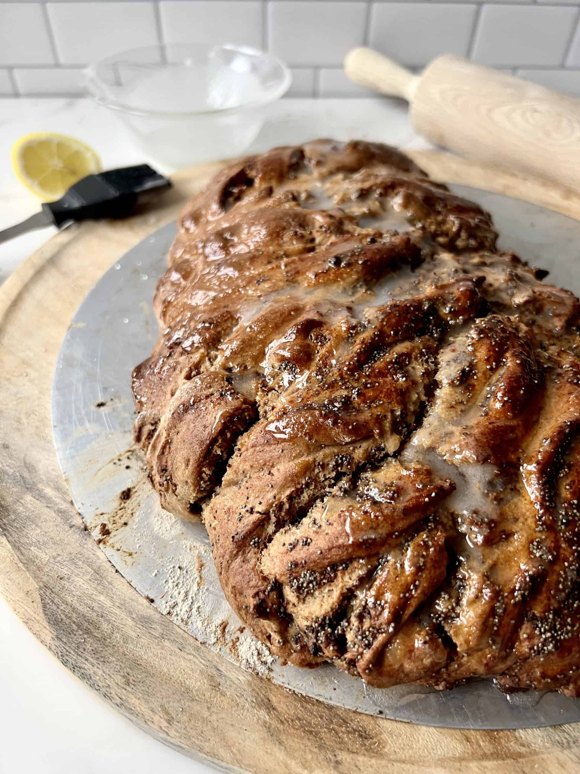 - Der Mohnzopf wird für ca. 40–45 Minuten bei 180 Grad/ Umluft im Backofen gebacken. In dieser Zeit können wir unsere Glasur aus Zitronensaft und Birkenzucker anrühren. Dieser Schritt ist allerdings optional, der Zopf schmeckt auch ohne die Glasur. Am besten esst ihr ein noch warmes Stück des Zopfs. Ich wünsche euch viel Spaß beim nachmachen und einen guten Appetit.