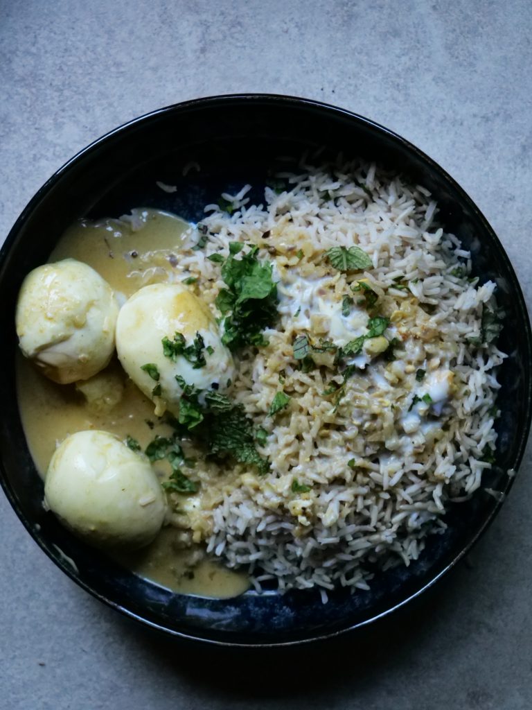 In einem Wok oder einer großen Pfanne 1 EL Ghee oder Kokosöl erhitzen und die Eier darin abraten, bis die eine schöne Kruste haben. Die Eier entnehmen und die kleingeschnittenen Zwiebel, Ingwer, Knoblauch und Chili mit den Senfkörnern anbraten.